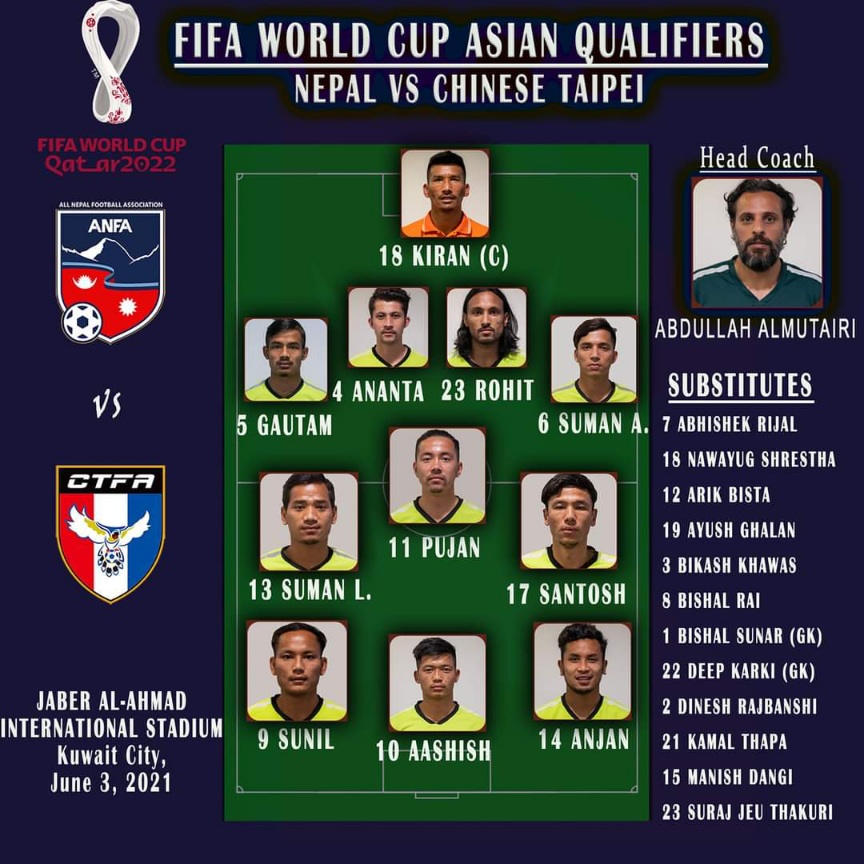 इराकसँगको खेल भन्दा ताइपेइसँगको खेलमा प्लेइङसेट फरक छ। नवयुग श्रेष्ठ र मनिष डाँगीको स्थान सुनिल बल र आशिष लामाले लिएका छन्।