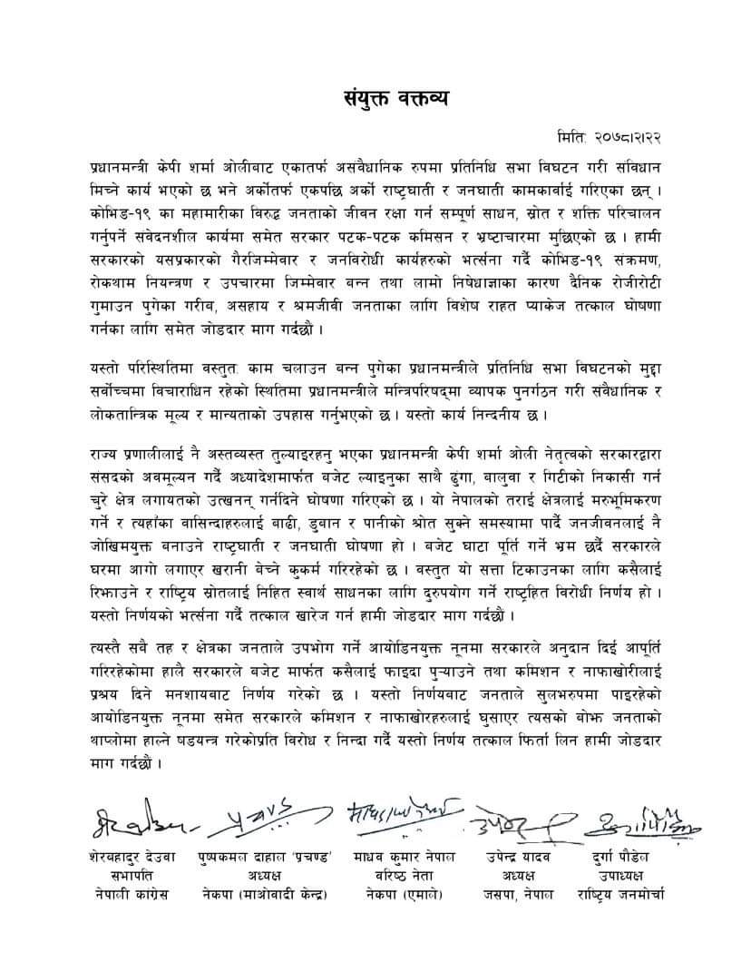 संयुक्त वक्तव्य जारी गर्दै उनीहरुले ओलीको कमदलाई अलोकतान्त्रिक भनेका छन्।