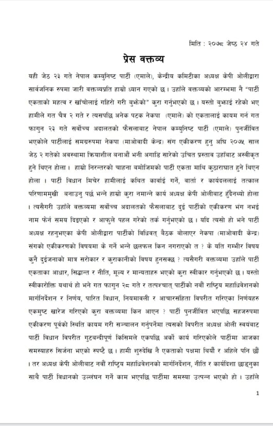 यस्तै, पार्टी एकताको महत्व र खाँचोलाई गहिरो गरी बुझेको भन्ने अध्यक्ष ओलीको वक्तव्यमा नेपाल पक्षले प्रश्नैप्रश्न गरेको छ।