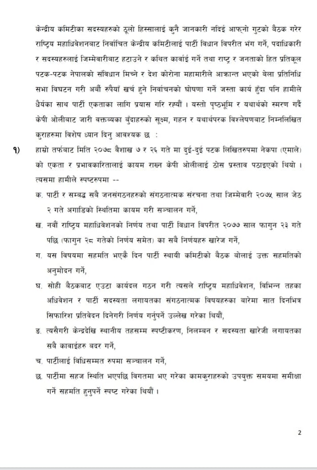 यस्तै, पार्टी एकतालाई कायम राख्न वैशाख ७ र २६ गते आफ्नो पक्षबाट गरिएको प्रस्तावबारे पनि पुनः स्मरण गराइएको छ। आफूहरुले राखेका प्रस्ताव सकारात्मक र रचानात्मक भए पनि अध्यक्ष ओलीको सोप्रति सकारात्मक दृष्टिकोण नभएको जवाफमा उल्लेख छ। आफू मनपरी गर्ने तर अरुलाई उपदेश दिनुको उपदेयता नभएको नेपाल पक्षको जवाफ छ।