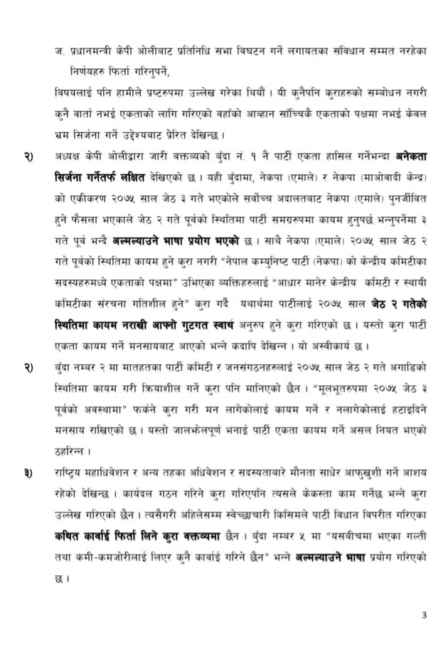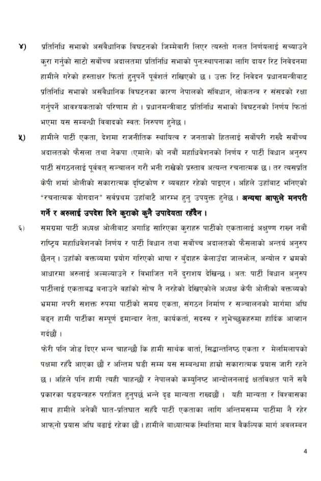 जवाफमा भनिएको छ, ‘प्रतिनिधि सभाको असंवैधानिक विघटनको जिम्मेवारी लिएर त्यस्तो गलत निर्णयलाई सच्याउने कुरा गर्नुको साटो अदालतमा प्रतिनिधि सभाको पुनःस्थापनाका लागि दायर रिट निवेदनमा हामीले गरेको हस्ताक्षर फिर्ता हुनुपर्ने पूर्वशर्त राखिएको छ। उक्त रिट निवेदन प्रधानमन्त्रीबाट प्रतिनिधि सभाको असंवैधानिक विघटनका कारण नेपालको संविधान, लोकतन्त्र र संसदको रक्षा गर्नुपर्ने आवश्यकताको परिणाम हो। प्रधानमन्त्रीबाट प्रतिनिधि सभाको विघटनको निर्णय फिर्ता भएमा यस सम्बन्धी विवादको स्वतः निरुपण हुनेछ।’