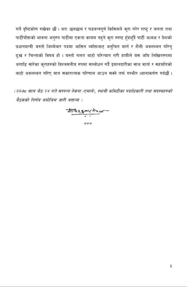 ओलीले विघटनसम्बन्धी निर्णय फिर्ता लिए विवादको स्वतः निरुपण हुने वरिष्ठ नेता नेपालद्वारा जारी वक्तव्यमा उल्लेख छ।
