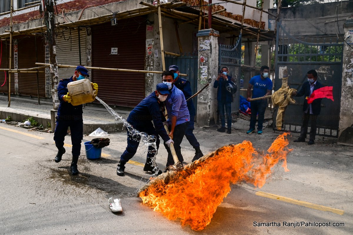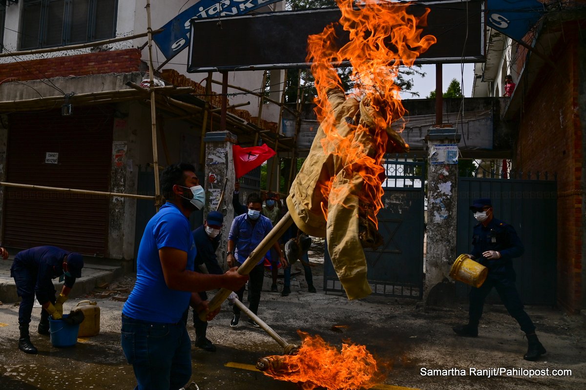 पुतलीसडकस्थित शंकरदेव क्याम्पस अगाडि भेला भएका नेविसंघका नेता तथा कार्यकर्ताले राजेन्द्र महतोको पुत्ला दहन गरेका हुन्। महतोको पछिल्लो अभिव्यक्तिलाई लिएर पुत्ता दहन गरेका हुन्। उनीहरुले चुरे दोहन, मूल्यबृद्धि लगायतका विषयमा चर्का नारा लगाएका थिए।