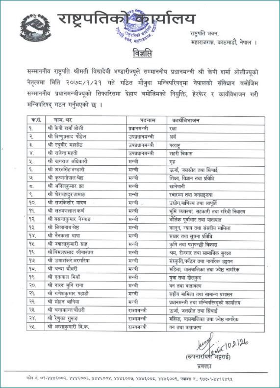 राष्ट्रपतिको कार्यालयले विज्ञप्ति जारी गर्दै प्रधानमन्त्री ओलीको नेतृत्वमा २०७८ वैशाख ३१ गते गठित मन्त्रिपरिषदलाई पुनर्गठन गरिएको जनाइएको छ।