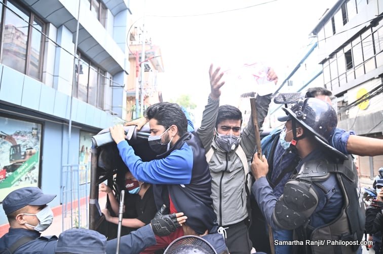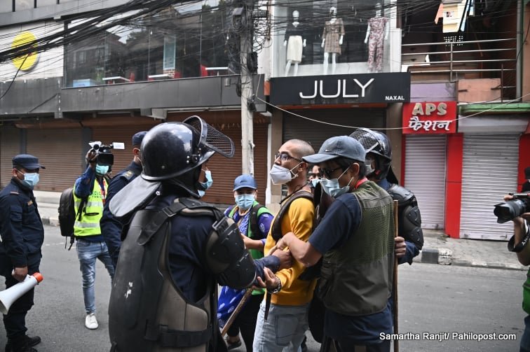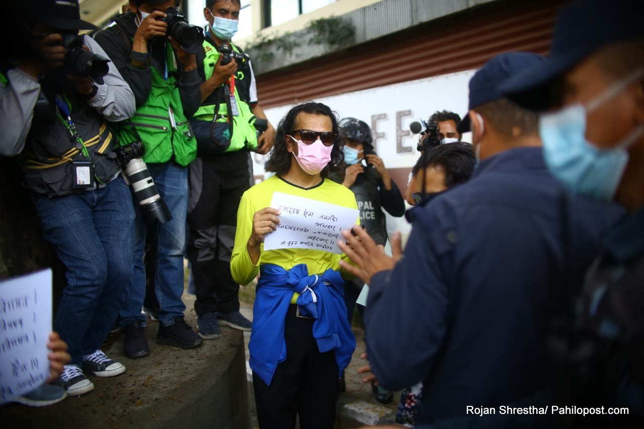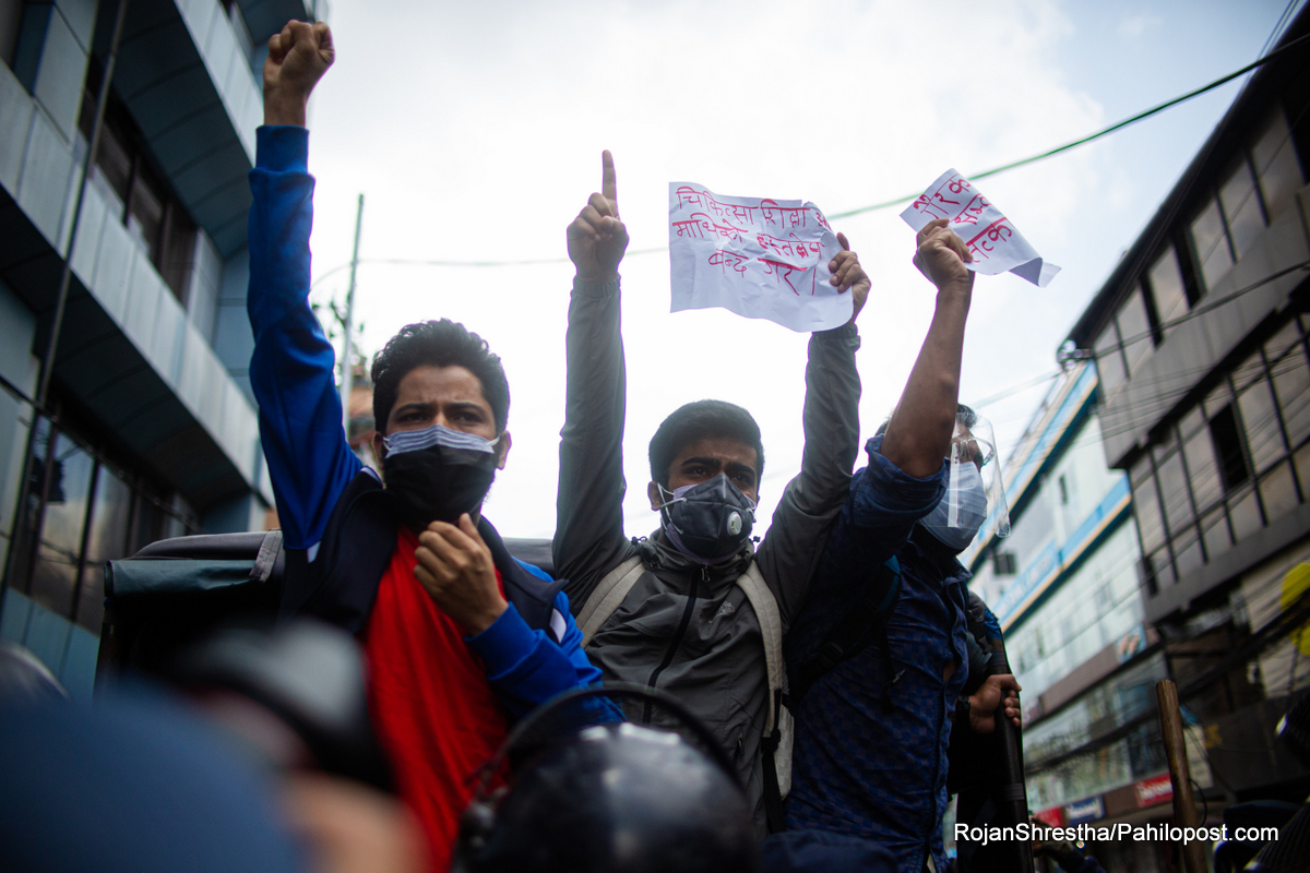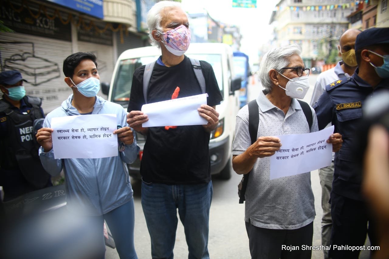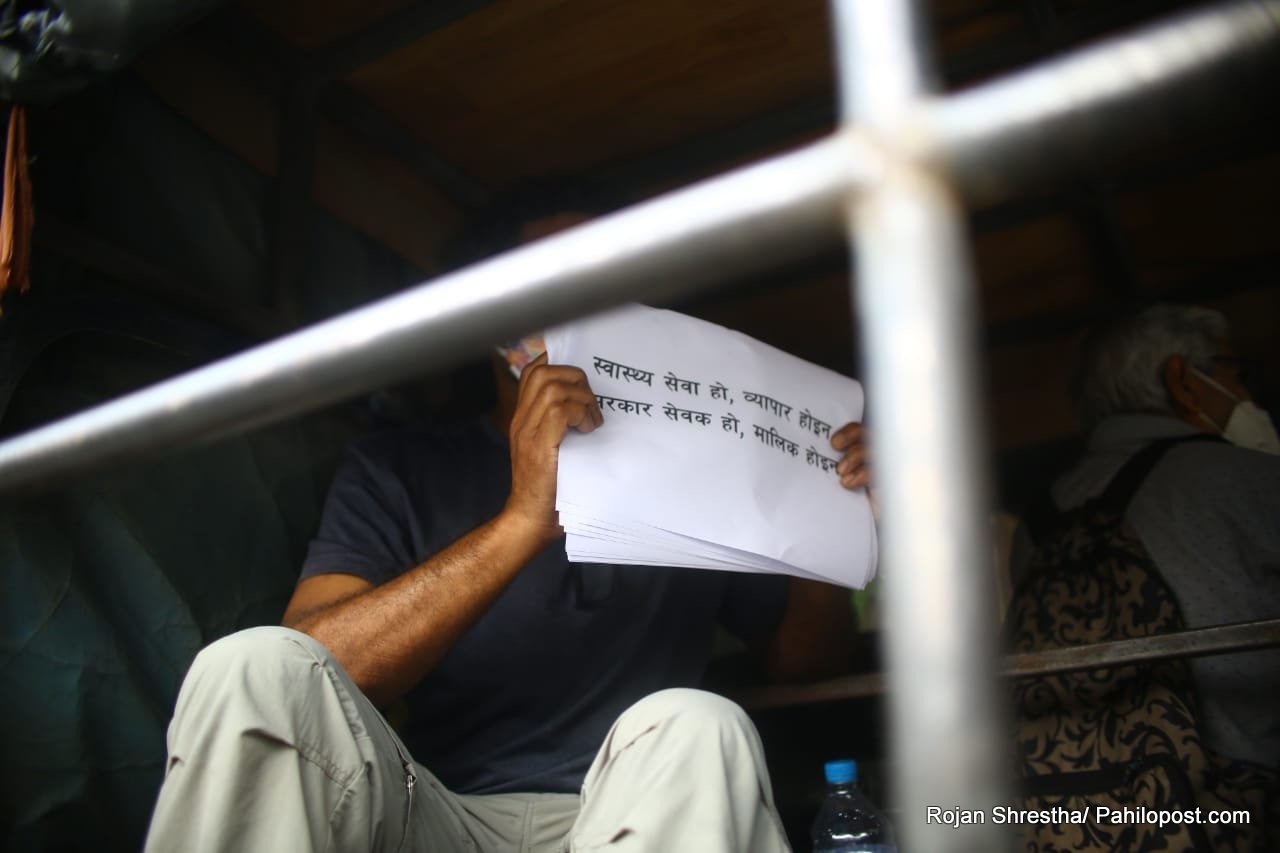 'स्वास्थ्य सेवा हो, व्यापार होइन। सरकार सेवक हो, मालिक होइन' लेखिएको प्ले कार्ड सहित सडकमा उत्रिएकाहरुलाई प्रहरीले नियन्त्रणमा लिएको हो। हिजो पनि यसैगरी सडक आन्दोलनमा उत्रिएकाहरु पक्राउ परेका थिए।