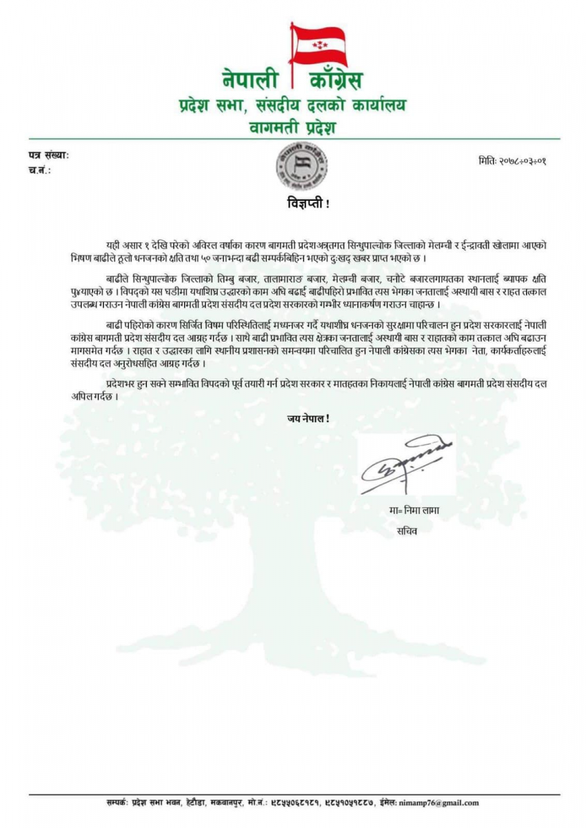कांग्रेसले बाढी प्रभावित क्षेत्रका जनतालाई अस्थायी बास र राहतको काम तत्काल अघि बढाउन प्रदेश सरकारसँग माग समेत गरेको छ। राहत र उद्धारका लागि स्थानीय प्रशासनको समन्वयमा परिचालित हुन नेपाली कांग्रेसका प्रभावित क्षेत्रका नेता, कार्यकर्ताहरुलाई संसदीय दलले अनुरोध गरेको छ।