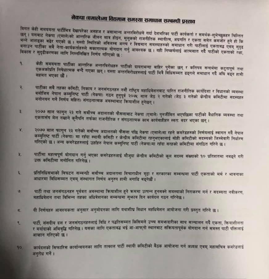 काठमाडौं: नेकपा (एमाले) को विवाद समाधानका लागि गठित कार्यदलले १० बुँदे सहमति गरेको छ।