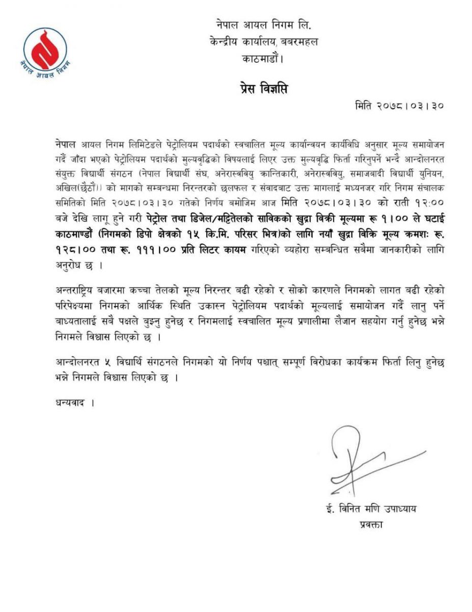 काठमाडौंः नेपाल आयल निगमले पेट्रोलियम पदार्थको भाउ घटाएको छ। आन्दोलनरत संयुक्त विद्यार्थी संगठनको माग सम्बोधनका लागि भन्दै निगमले पेट्रोल डिजेल र मट्टीतेलमा एक÷एक रुपैयाँ मूल्य घटाएको हो।