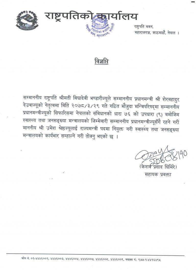 प्रधानमन्त्रीको सिफारिसमा राष्ट्रपति विद्यादेवी भण्डारीले संविधानको धारा ७६ को उपधारा ९ बमोजिम श्रेष्ठलाई राज्यमन्त्रीमा नियुक्त गरेको राष्ट्रपतिको कार्यालयले विज्ञप्तिमार्फत् जानकारी गराएको छ।