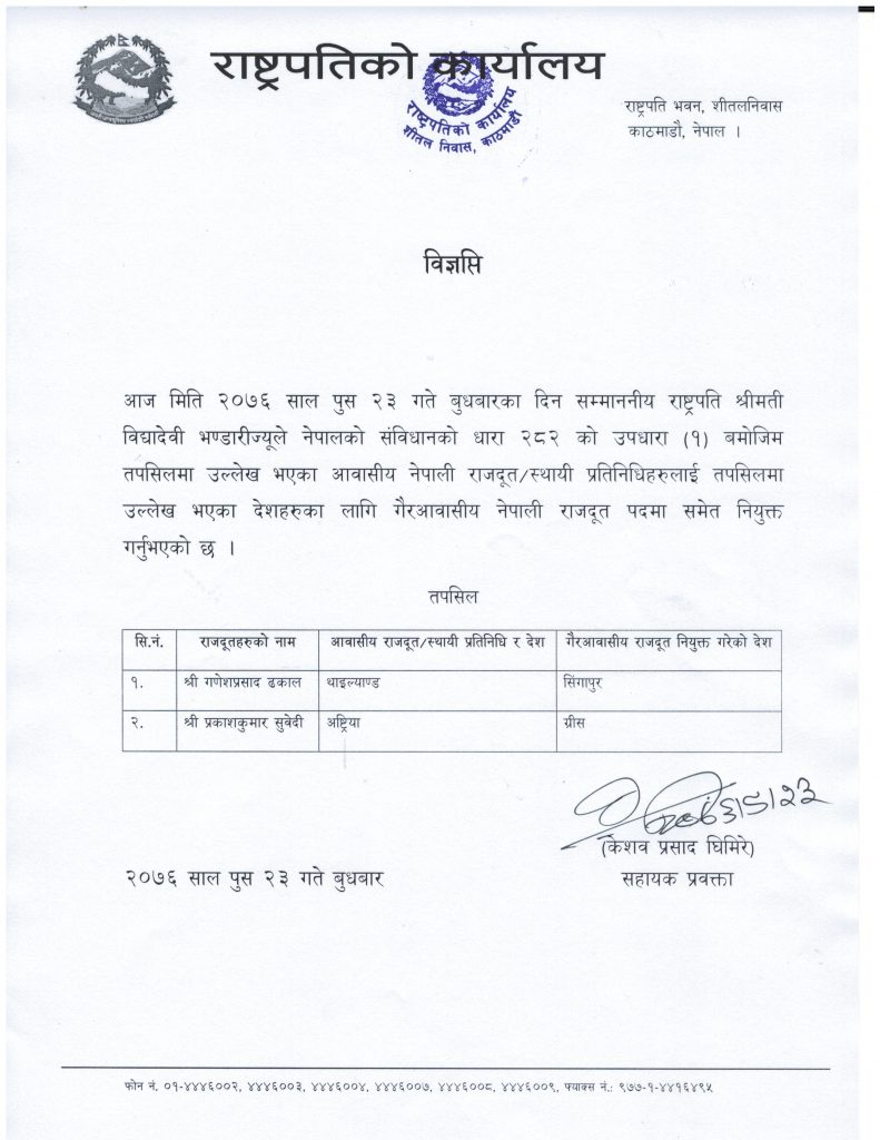 राष्ट्रपति कार्यालयबाट २०७६ पुस २३ गते जारी भएको ढकालको नियुक्ती सम्बन्धी सूचना।