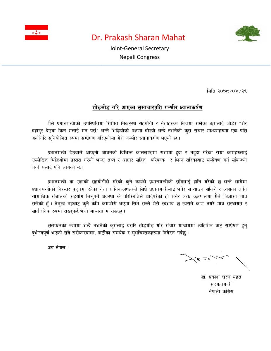 'मैले प्रधानमन्त्रीको उपस्थितिमा सीमित निकटस्थ सहयोगी र नेताहरुका बिचमा राखेका कुरालाई जोडेर शेरबहादुर देउवा किन मलाई मन पर्छ भन्ने भिडियोको पक्षमा बोल्यो भन्दै नभनेको कुरा संचार माध्यमहरुमा एक पछि अर्कोगरि सुनियोजित रुपमा सम्प्रेषण गरिएकोमा मेरो गम्भीर ध्यानाकर्षण भएको छ,' प्रेस नोटमा महतले भनेका छन्।
