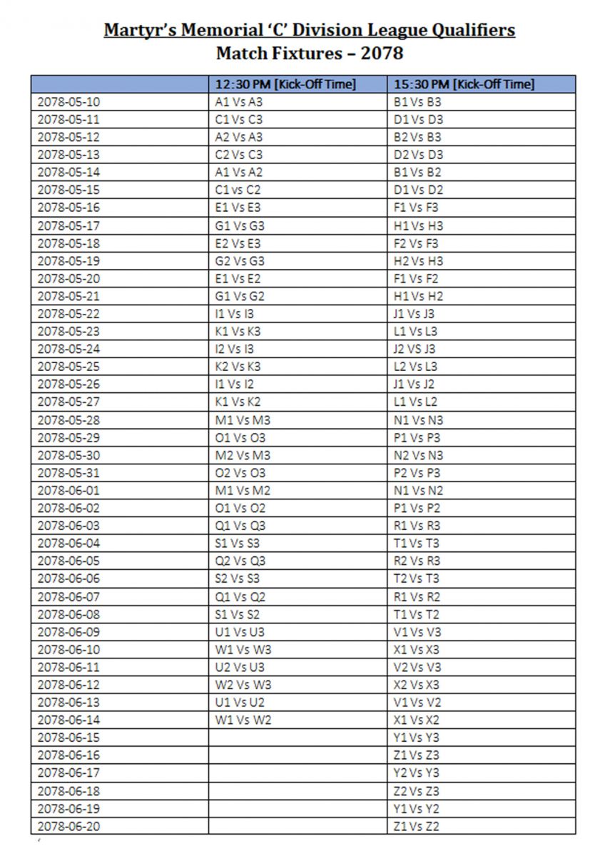 प्रतियोगिताको टाइसिट ड्र आज सार्वजनिक भएको हो। प्रतियोगिताबाट तीन क्लब सी डिभिजनका उक्लने छन्।
