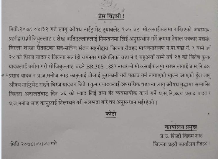 साउन ३२ गते पत्रकार मोहम्दको मोटरसाइलबाट लागू औषध नाइट्रेभेट फेला परेको थियो। रौतहट एक्सप्रेस अनलाइनका पत्रकार मोहम्मद मोजीबुल्लाहलाई रौतहट प्रहरीले नाटकीय रुपमा लागू औषध घटनामा फसाएको नेपाल पत्रकार महासंघ रौतहटका अध्यक्ष प्रेमचन्द्र झाले दाबी गर्दै आएका थिए।