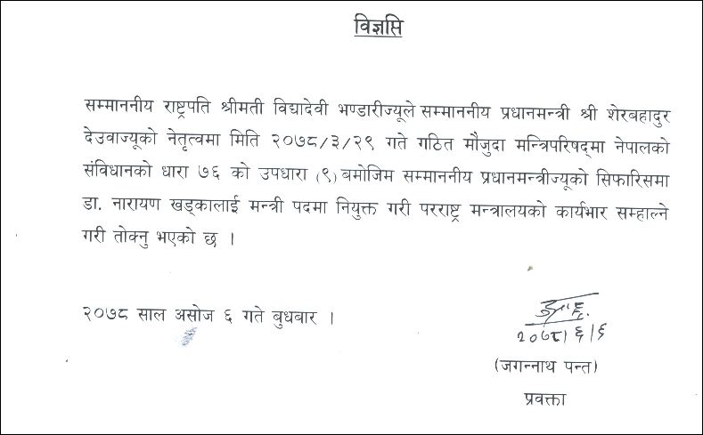 हिजोमात्र सत्तारुढ गठबन्धनका शीर्ष नेतृत्वबिच खड्कालाई मन्त्री बनाउने सहमति भएको थियो। सहमतिको भोलिपल्ट आज राष्ट्रपति भवन शीतल निवासमा शपथ ग्रहण कार्यक्रमको आयोजना भयो। आजै मन्त्री खड्का अमेरिका जाँदैछन्।
