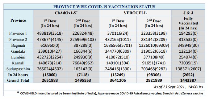 हालसम्म नेपालमा २६ लाख ५१ हजार ८८३ जनाले अस्ट्राजेनेकाको पहिलो डोज र १४ लाख ९५ हजार ५५३ जनाले दोस्रो डोज लगाइसेका छन्। त्यस्तै भेरोसेलको पहिलो डोज लगाउनेको संख्या ३६ लाख ४१ हजार २०६ पुगेको छ भने २९ लाख २१ हजार ९८९ जनाले दोस्रो डोज लगाइसकेका छन्।
