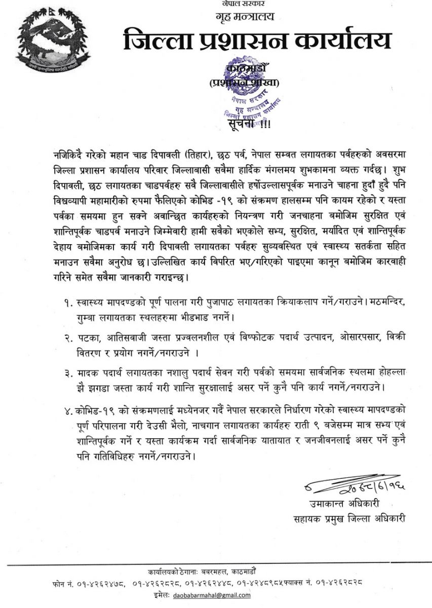 यस्तै, मठ, मन्दिर, गुम्बा लगायतको पूजापाठ स्थलमा भीडभाड नगर्न पनि आग्रह गरेको छ। पटका, आतिसबाजी जस्ता विस्फोटक पदार्थ उत्पादन ओसारपसार र बिक्री बितरण नगर्न पनि प्रशासनले आग्रह गरेको छ।