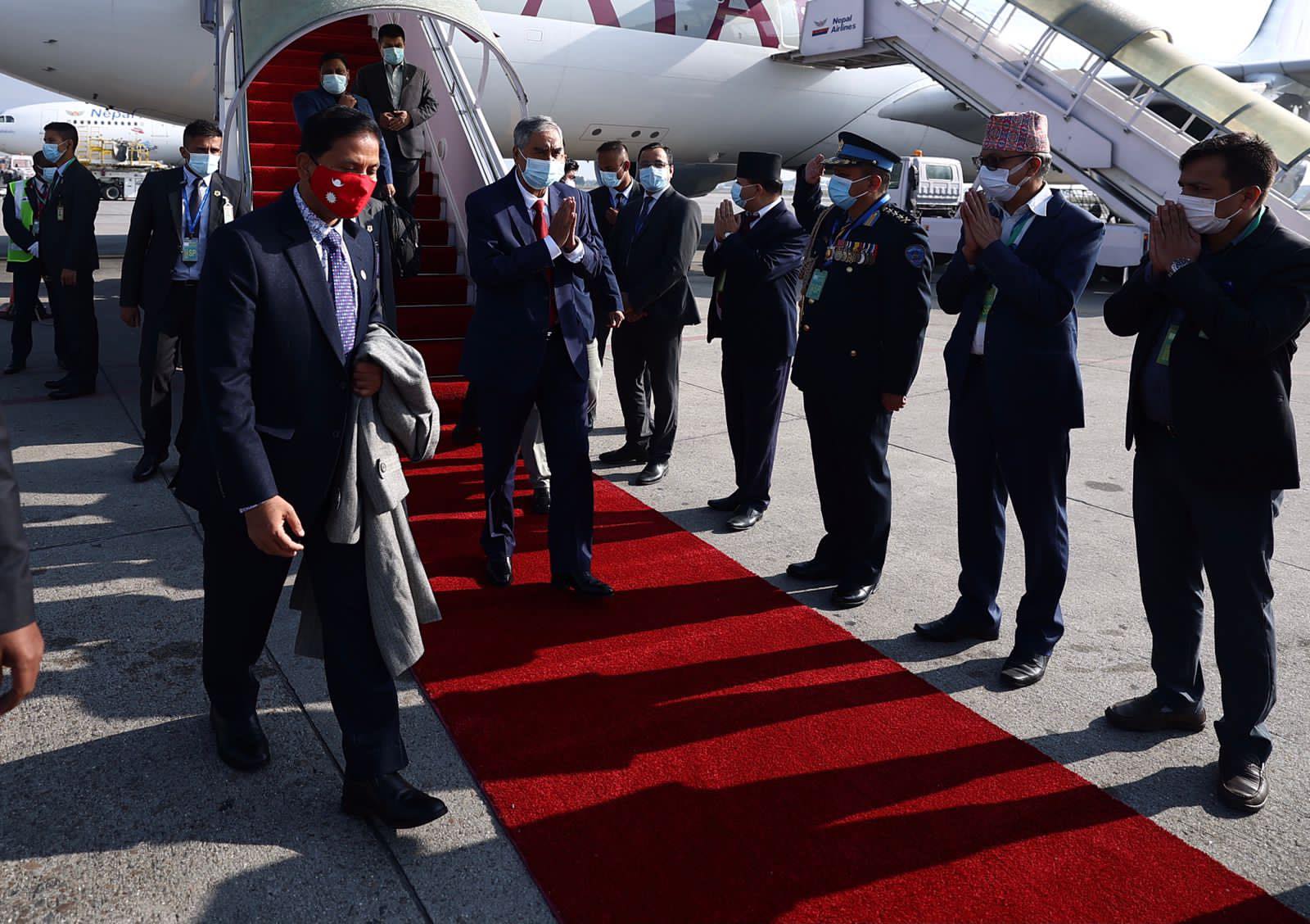 प्रधानमन्त्रीको टोलीलाई स्वागत गर्न गृहमन्त्री बालकृष्ण खाण, परराष्ट्रमन्त्री डा नारायण खड्का, सञ्चारमन्त्री ज्ञानेन्द्रबहादुर कार्की, रक्षामन्त्री डा मीनेन्द्र रिजाललगायत विमानस्थलमा पुगेका थिए।