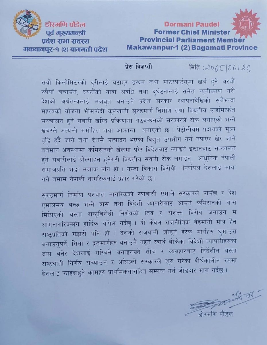 हेटौंडा : वाग्मती प्रदेशका पूर्वमुख्यमन्त्री डोरमणि पौडेलले विद्युतीय सवारी खरिदप्रक्रिया र सुरुङमार्ग निर्माण प्रक्रिया रोक्ने प्रदेश सरकारको निर्णय राष्ट्रघाती भएको बताएका छन्। प्रेस विज्ञप्ति जारी गर्दै पौडेलले गठबन्धन सरकारको उक्त निर्णय देशलाई गरिब नै बनाइराख्ने सोच र व्यबहारबाट निर्देशित भएको आरोप समेत लगाएका छन्।