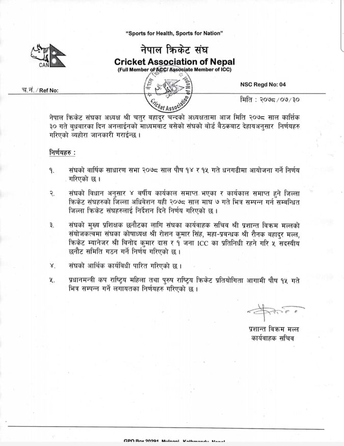 बैठकले आर्थिक कार्यविधि पास गरेको छ भने आगामी पुस १५ भित्र प्रधानमन्त्री कप राष्ट्रिय पुरुष तथा महिला क्रिकेट प्रतियोगिता सम्पन्न गर्नेसमेत निर्णय गरेको छ।