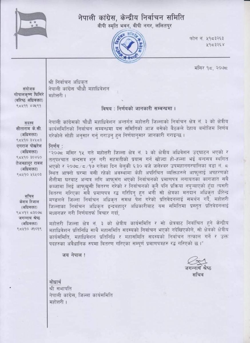 जनकपुरधाम : नेपाली कांग्रेस केन्द्रीय निर्वाचन समितिले १४ औं महाधिवेशन अन्तर्गत महोत्तरी क्षेत्र नम्बर–३ को क्षेत्रीय कार्यसमितिलाई वितरण गरेको प्रमाणपत्र रद्द गर्ने निर्णय गरेको छ।