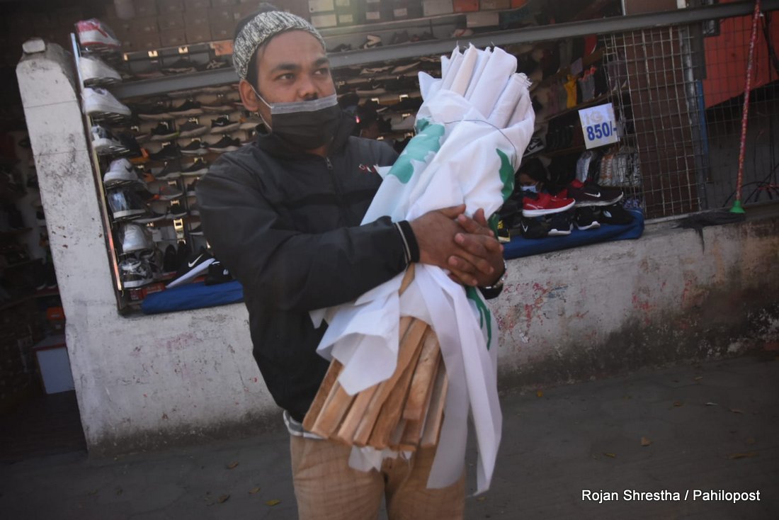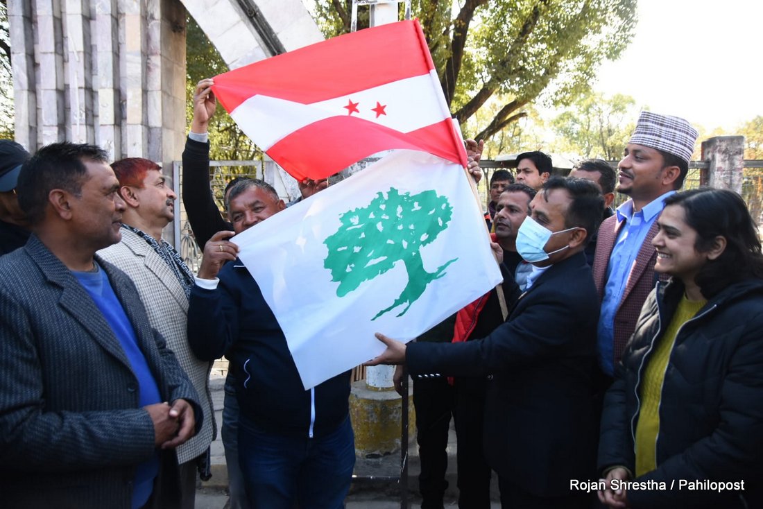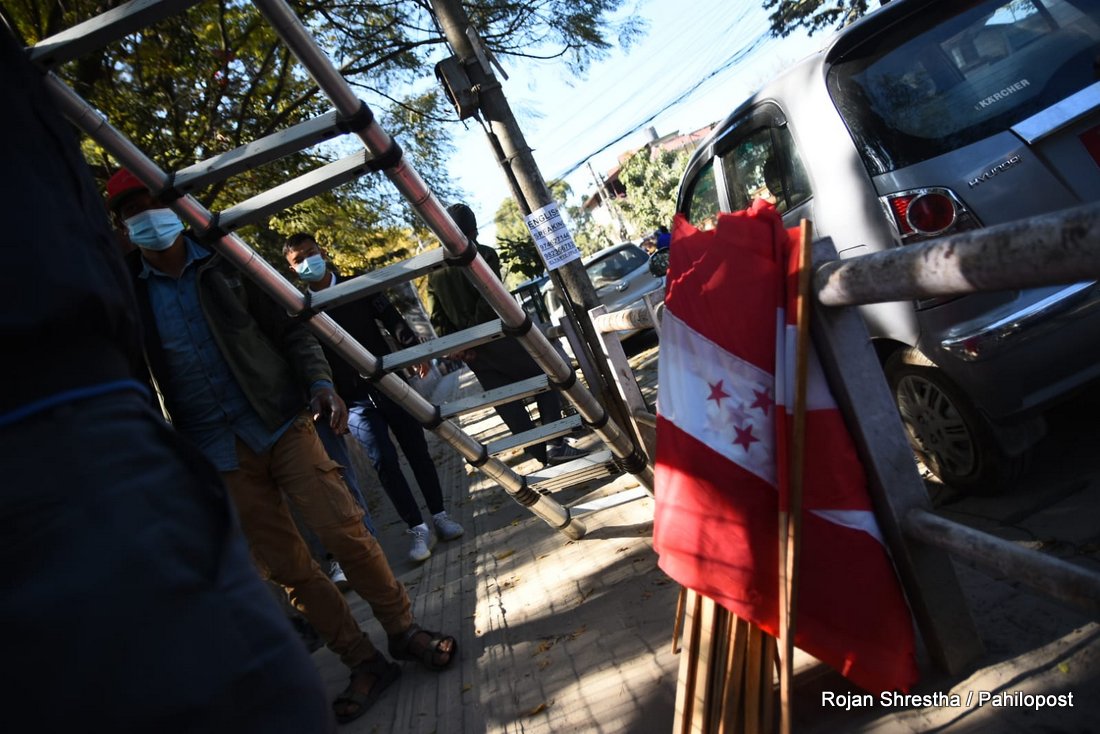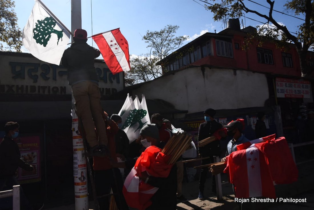 कांग्रेस प्रवक्ताले झण्डा हस्तान्तरण गरेसँगै भृकुटीमण्डपमा झण्डा राख्न सुरु गरिएको छ। कांग्रेसल रुख र चार तारे झण्डा गरी भृकुटीमण्डपभर करिब ५ हजार झण्डा राख्ने जनाएको छ।