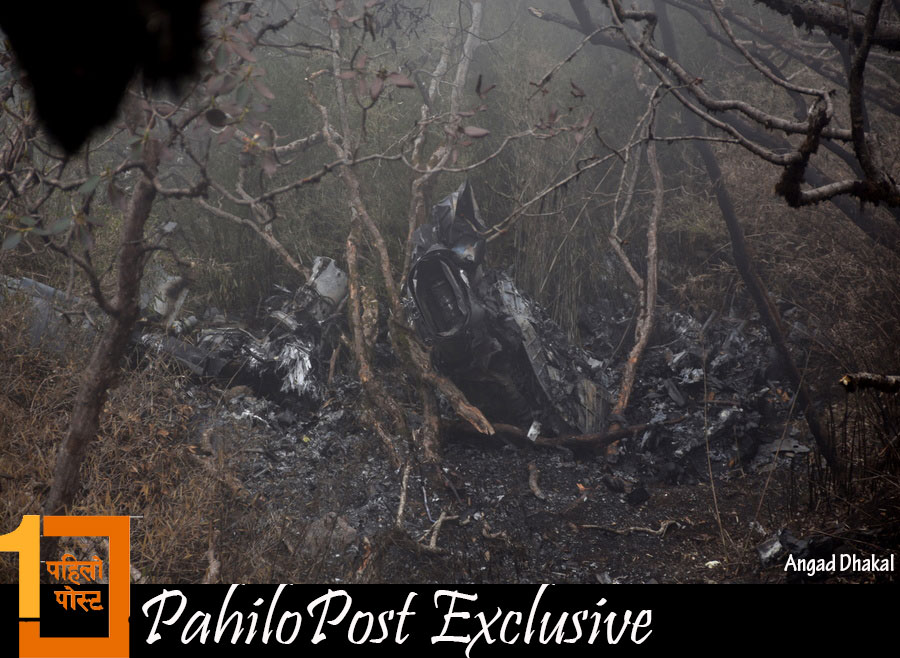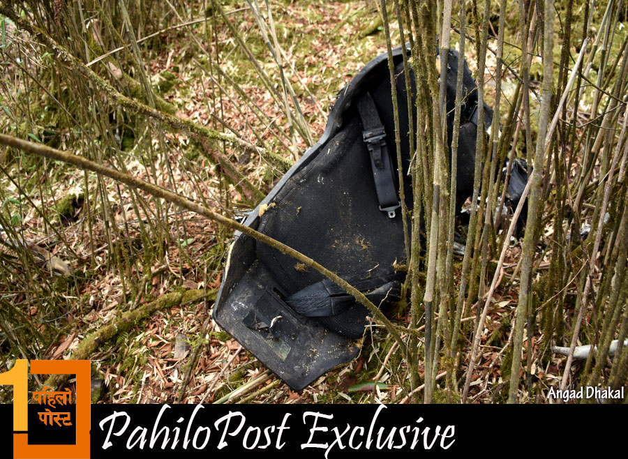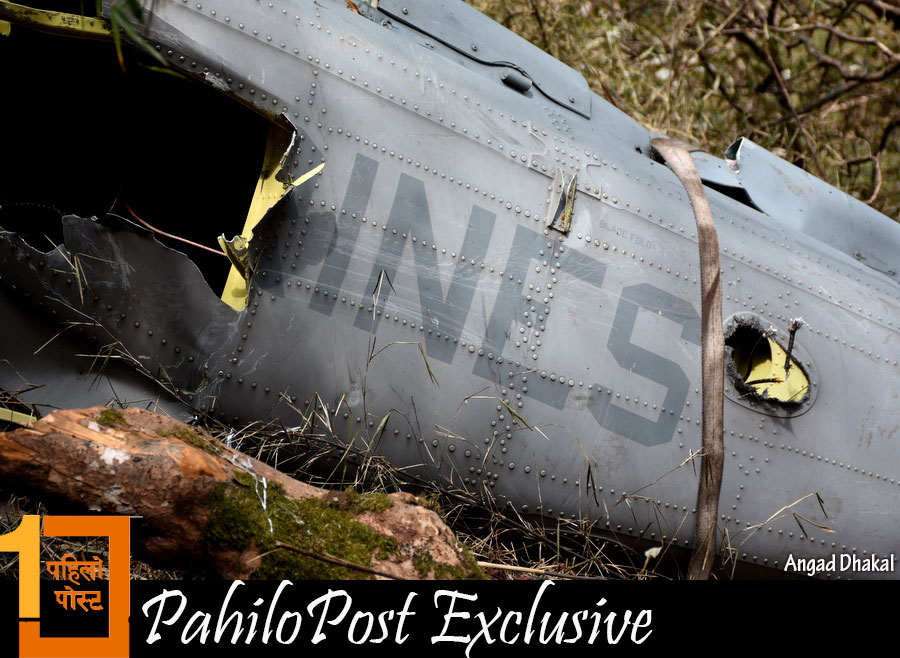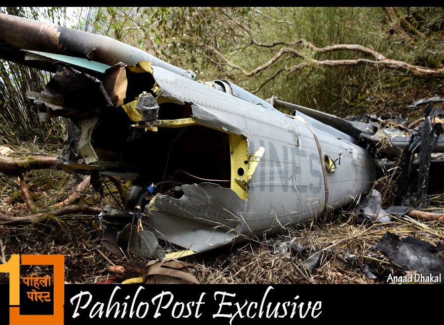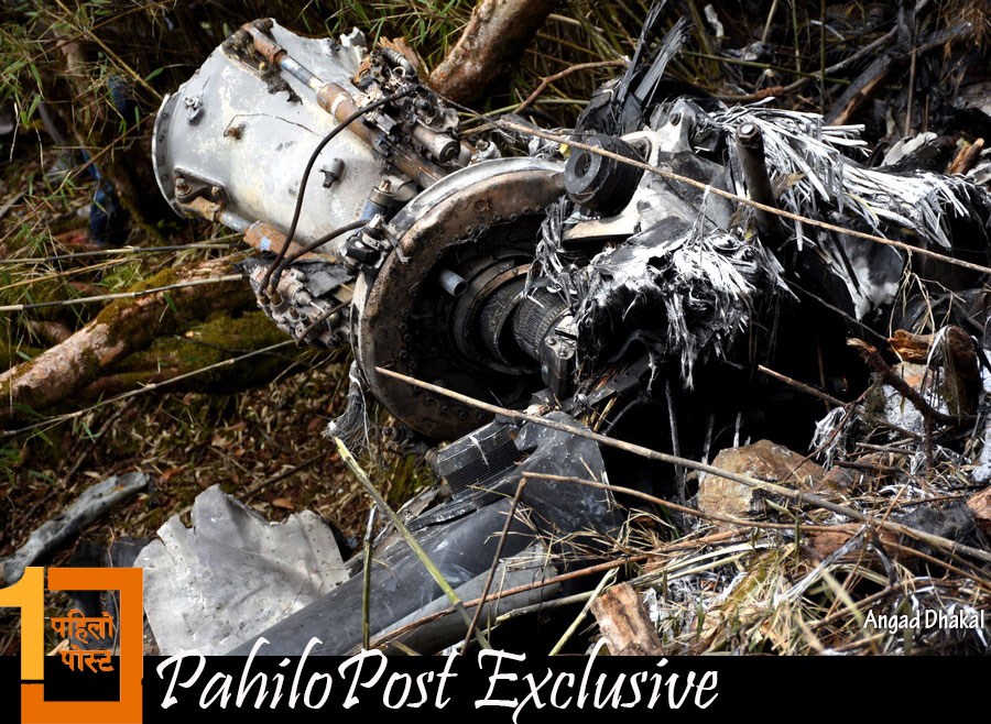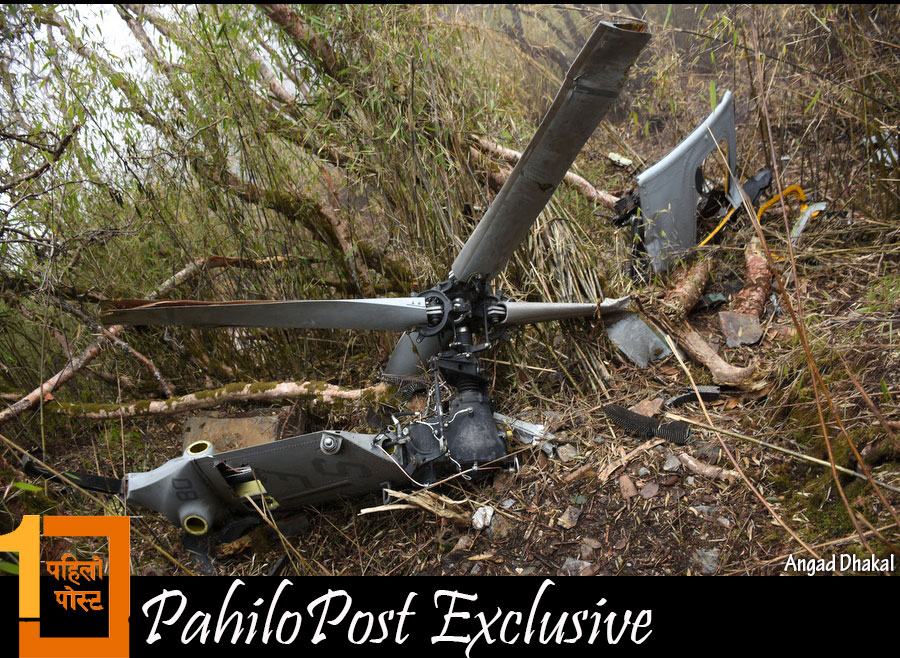 हेलिकप्टरका यी दुई भाग भेटिएको स्थानबाट तलतिर ठूलो पहिरो छ। करिब २ सय मिटर तलसम्म हामीले हेलिकप्टरबाट उछिट्टिएका चोइटाहरु देख्न सक्यौं। चिमाल र पैयुँका रुख र कांगियो घाँस लछार्दै हेलिकप्टर ठाडो चट्टानमा ठोकिएको देखिन्थ्यो। त्यहाँबाट तलतिर झरेर हेलिकप्टर टुक्राटुक्रा भएको थियो।